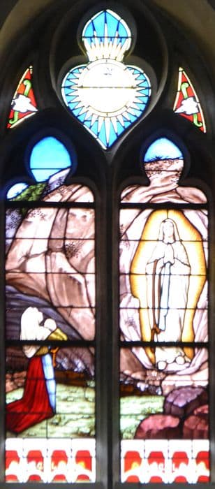 neuf verrières : Sainte Famille (baie 4), Couronnement de Charles VII (baie 5), Apparition du Sacré-Coeur à Marguerite Marie Alacocque (baie 7), Apparition de la Vierge à Bernadette Soubirous (baie 9), Délivrance de Saint Pierre par un ange (baie 11), Saint François de Sales enseignant (baie 16), Education de Saint Louis (baie 13), Sainte Elisabeth de Hongrie distribuant du pain aux mendiants (baie 18), Vierge à l'Enfant apparaissant aux poilus dans les tranchées (baie 15)