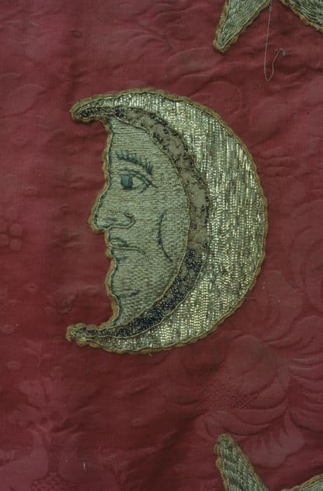 soie : tissu façonné, application sur textile, brodé, polychrome ; fil métal (or)