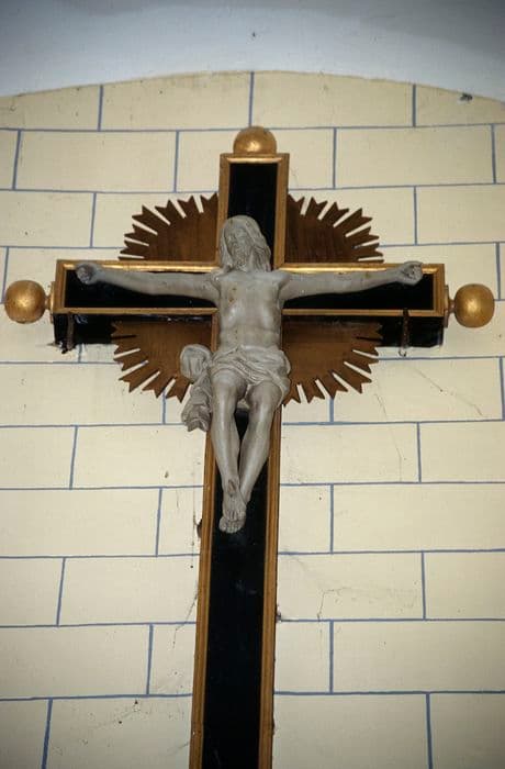 Grand blason surmonté d'un Christ en croix.