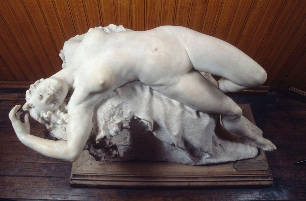 La Bacchante est représentée couchée sur une pierre dans une pose très lascive.