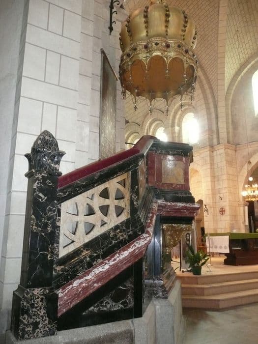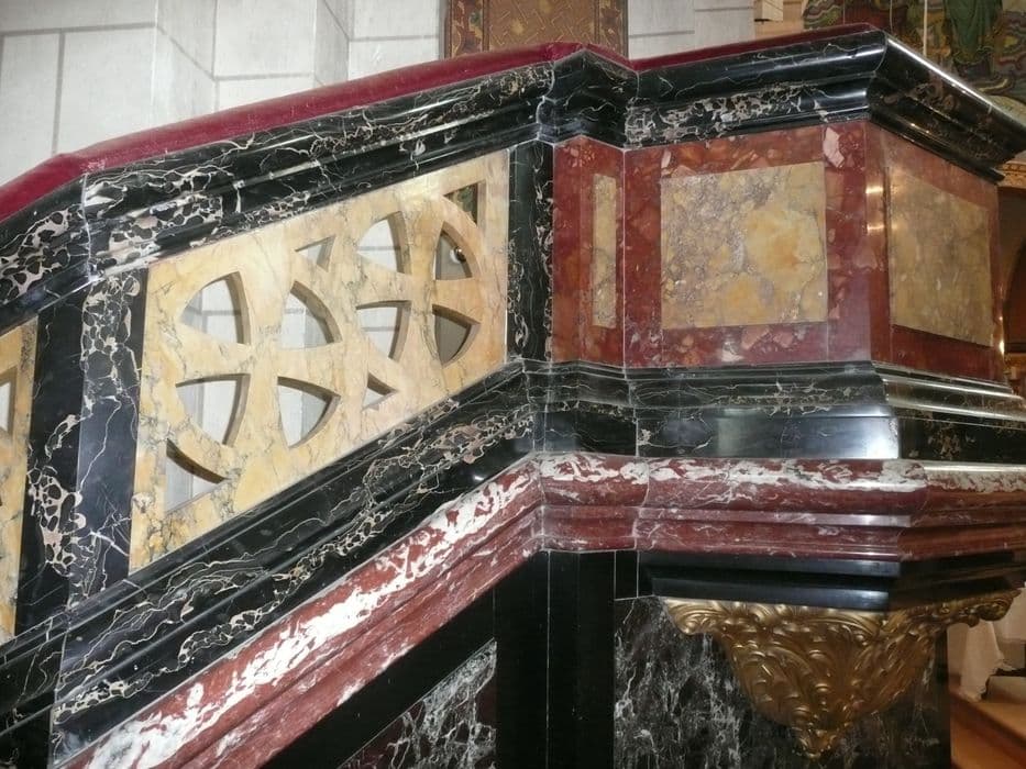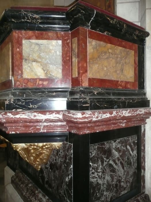 Chaire à prêcher en marbre polychrome, tôle dorée et verroterie (dôme), toile peinte et dorée (dosseret).
