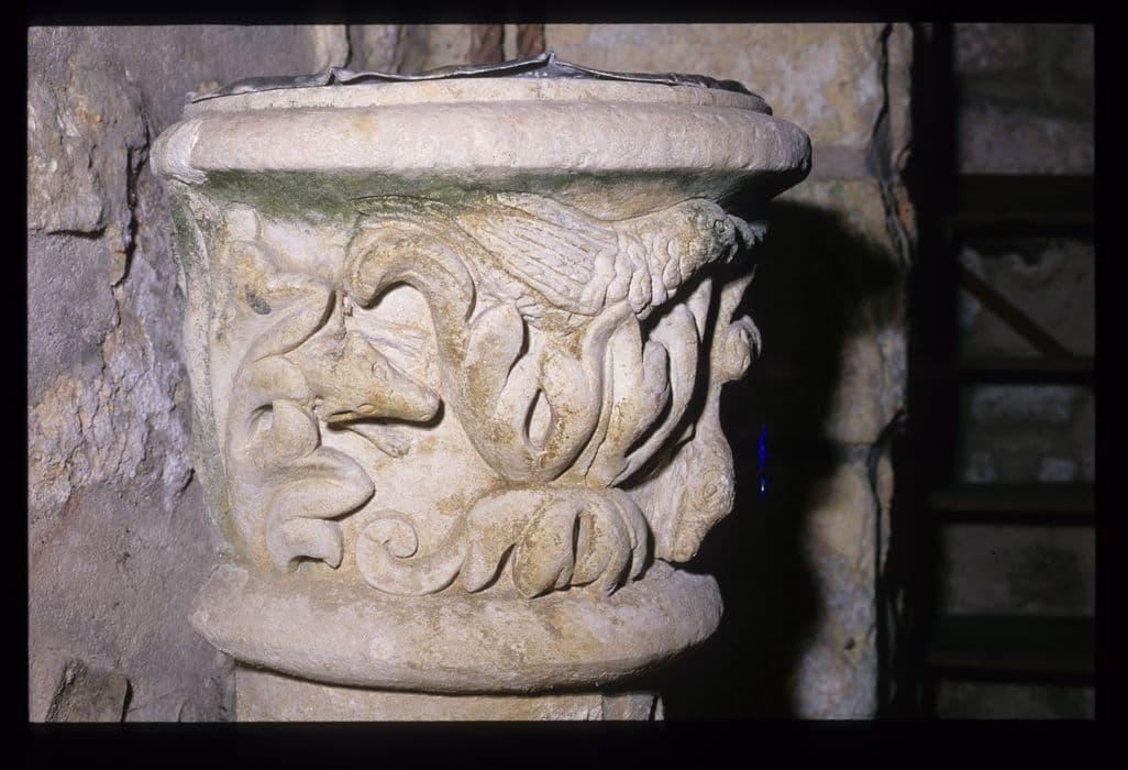 Sur une colonne cannelée est une cuve en forme de chapiteau ornée de moulures et de sculptures avec des animaux fantastiques.
