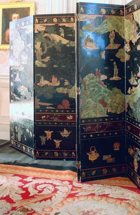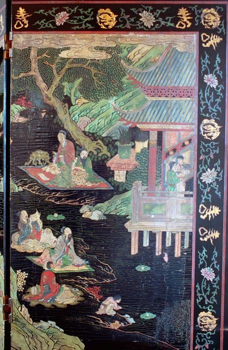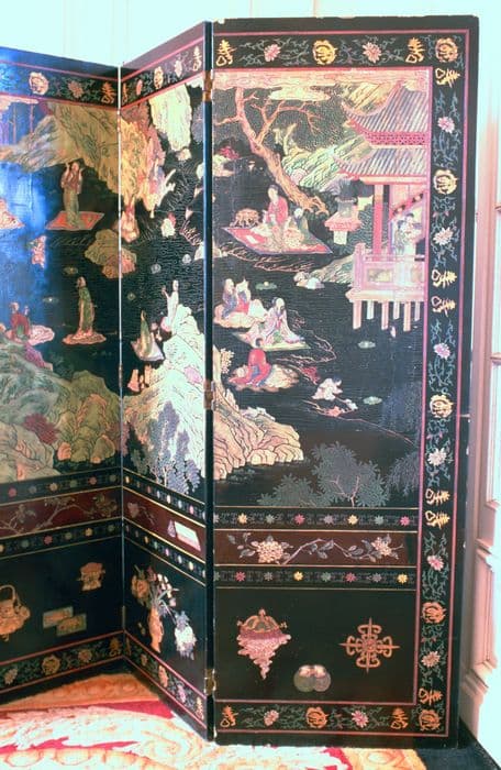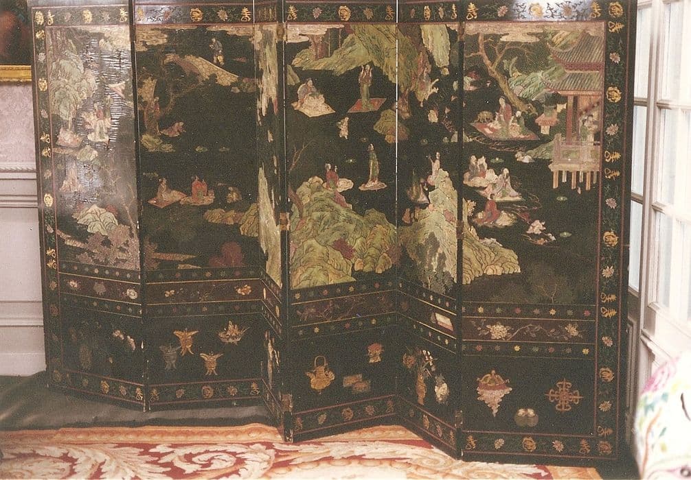 Paravent à 6 panneaux peints à la laque orientale de Chine ou laque de Coromandel.