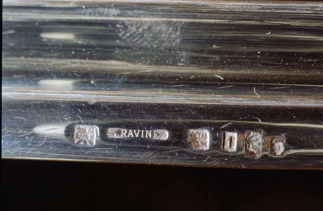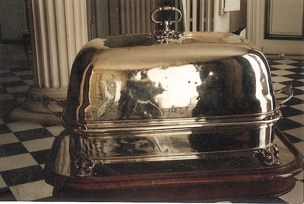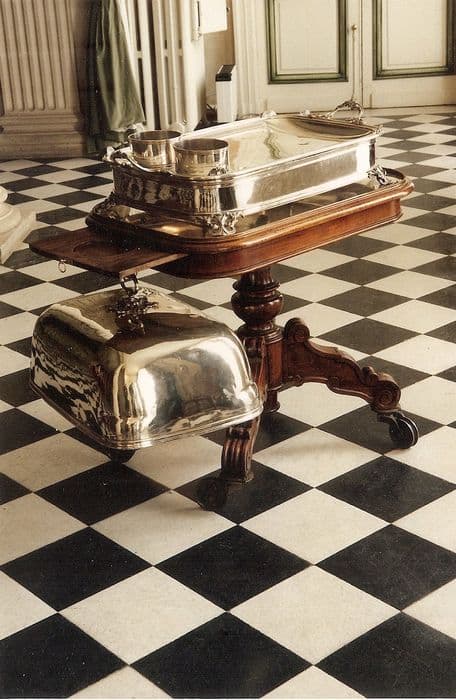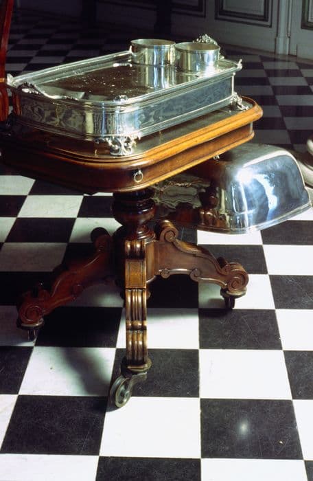 Table en bois et métal, montée sur roulettes, sur laquelle est posé un nécessaire à trancher en métal avec son couvercle.