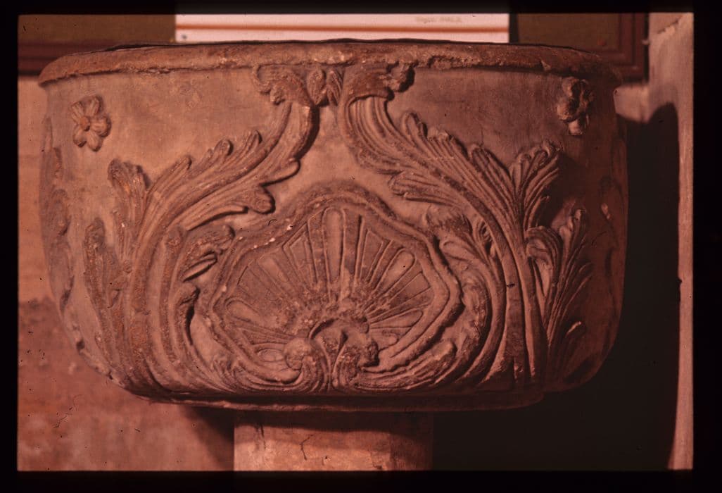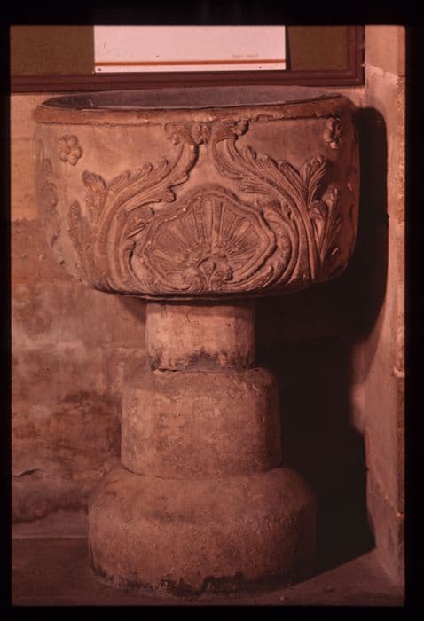 Bénitier en pierre calcaire dont le pied et la cuve sont ornés de cannelures.