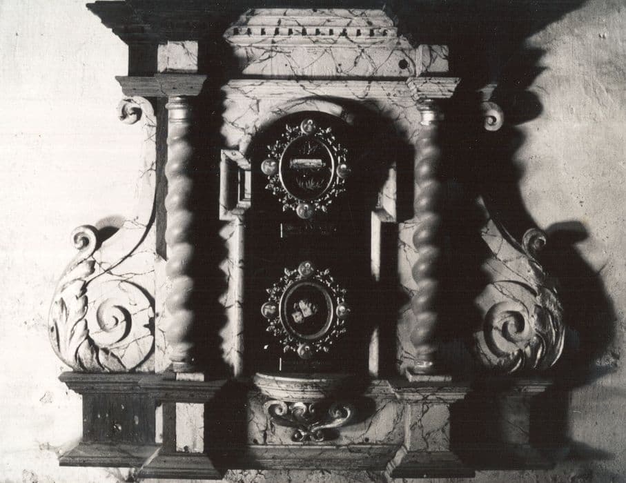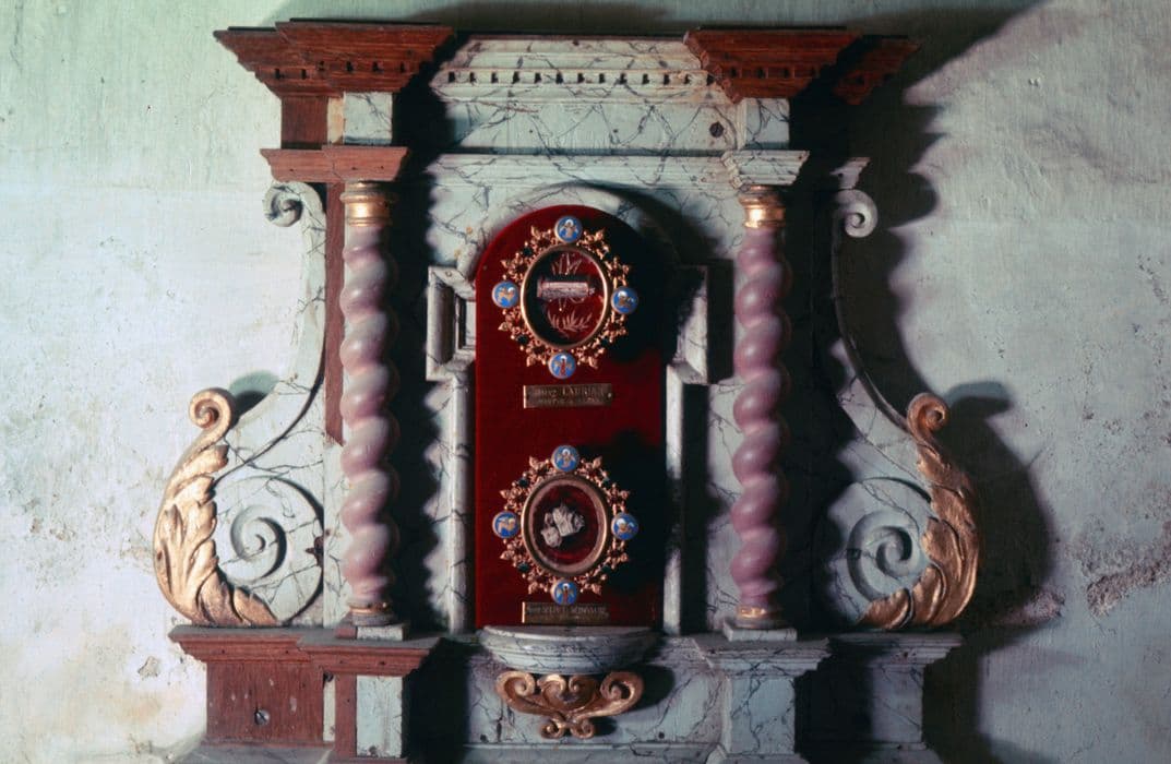 Reliquaire composé d'une structure architecturée en bois peint (faux marbre) renfermant les boîtiers métalliques contenant les reliques.