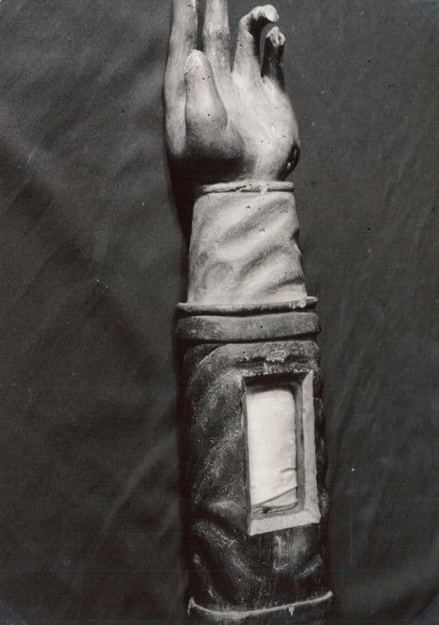 Bras-reliquaire en bois fruitier, dont la main fait un geste de bénédiction.