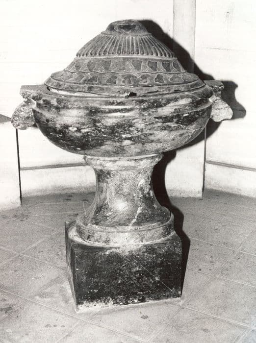 Fonts baptismaux en marbre avec couvercle en cuivre ouvragé, composé d'un pied soutenu par un socle et portant la cuve, munie de deux anses ou oreilles.