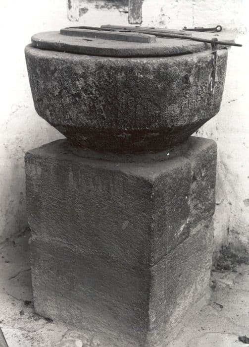 Fonts baptismaux composés d'un haut socle sur lequel est posée une cuve munie de son couvercle.