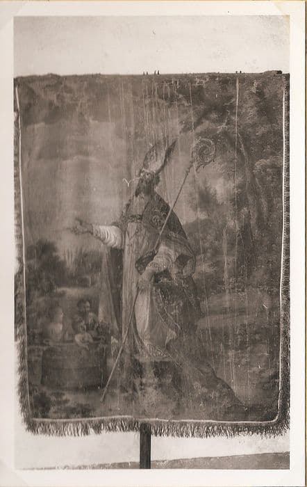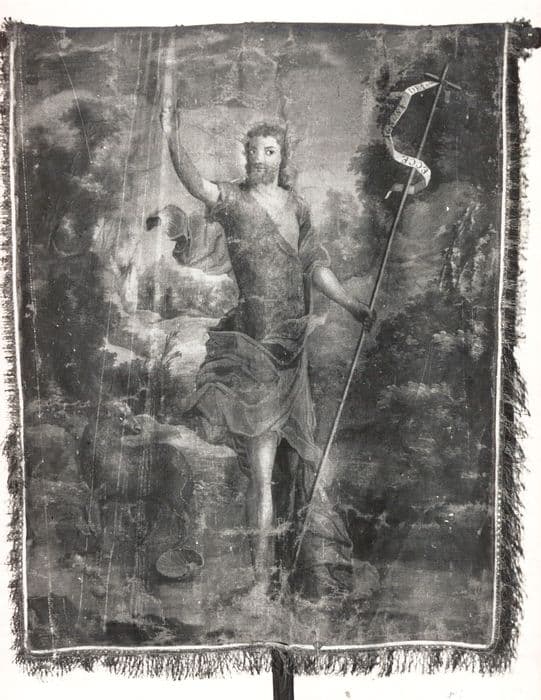 Représentation des saints Jean-Baptiste et Nicolas sur chacune des faces de la bannière.