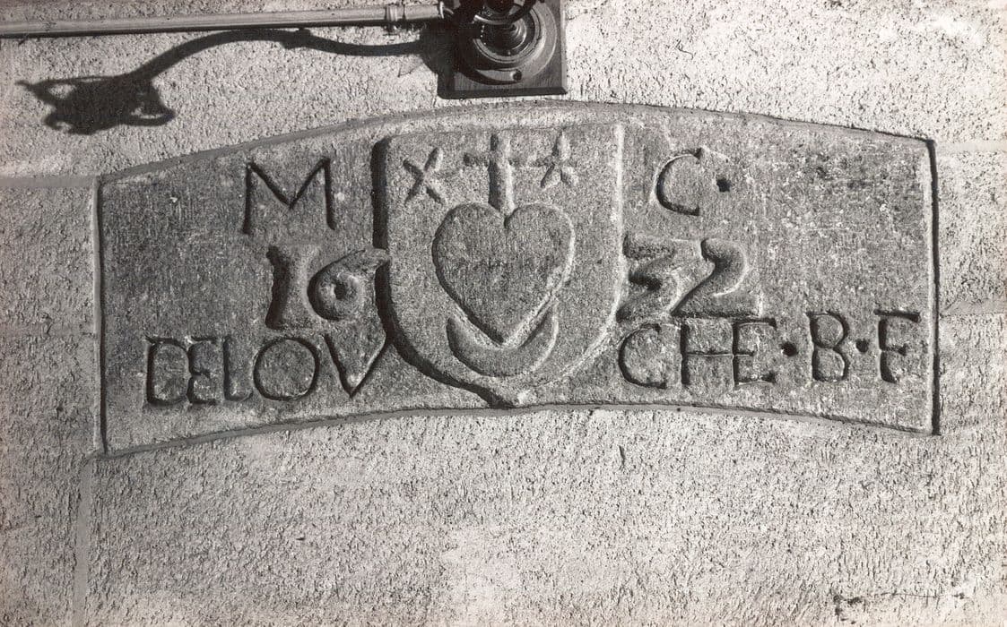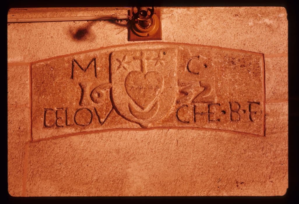 Pierre intégrée dans le mur portant une inscription gravée et un décor en bas-relief.