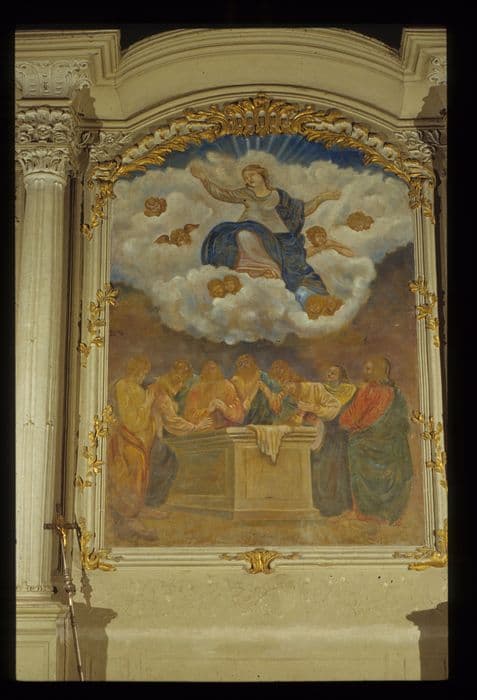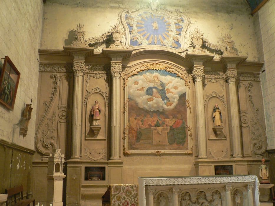 Retable en stuc peint en gris ; Assomption directement peinte à l'huile sur le fond ; statues de saint Etienne et de saint Cyran en plâtre polychrome.