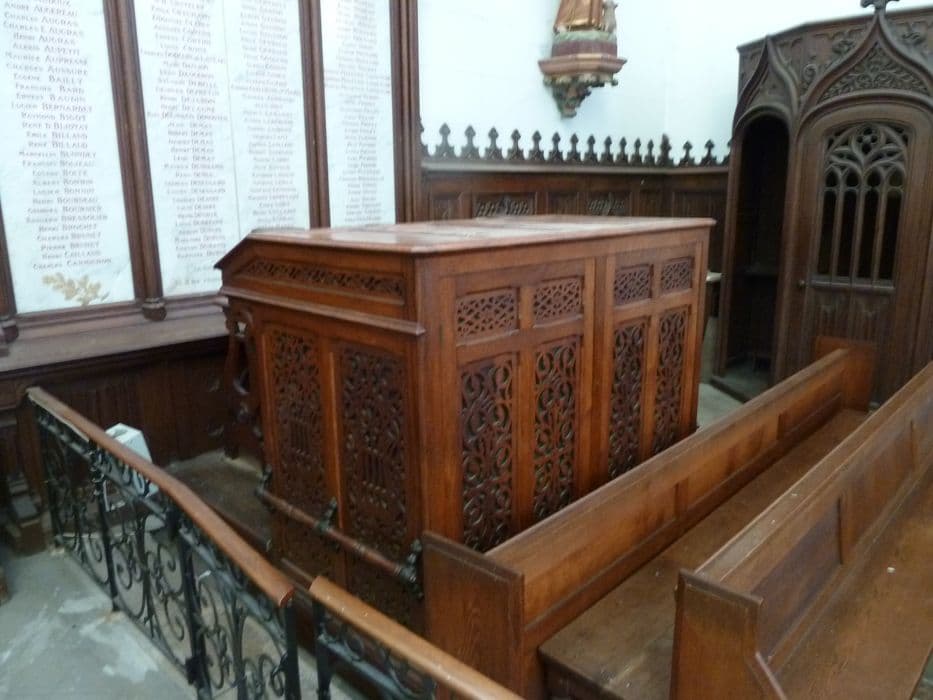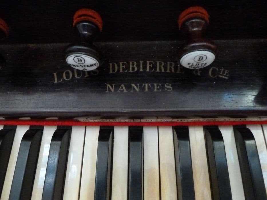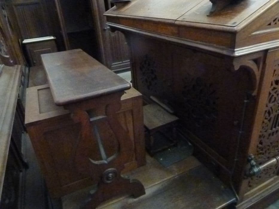 Orgue de mission portatif et positif (que l'on peut poser) avec corps en chêne, banc en forme de lyre.