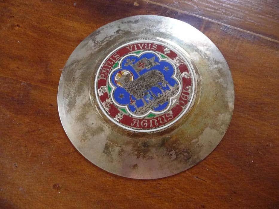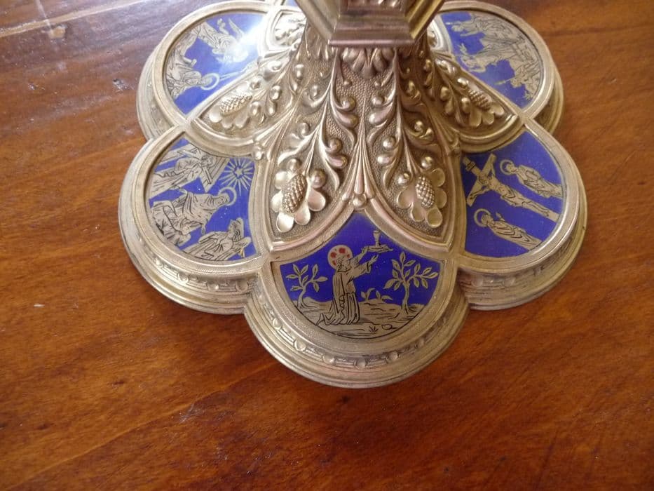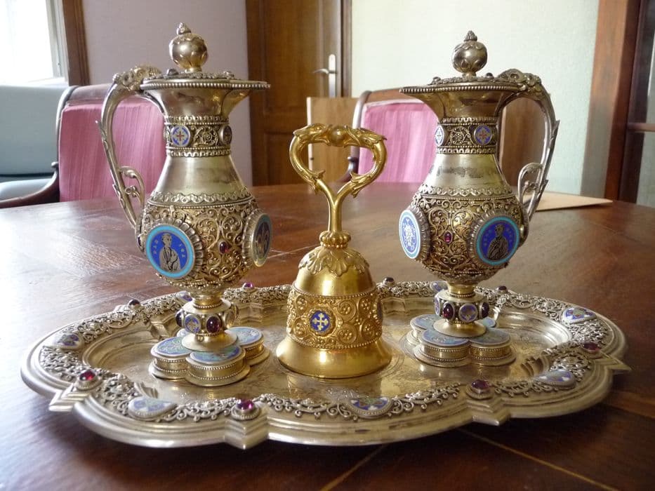 Ensemble composant la chapelle de messe, dite aussi chapelle eucharistique : calice et patène en argent et vermeil ; incrustation de médaillons émaillés sur la fausse-coupe, le noeud et le pied, et de cabochons violets ; burettes en métal argenté sur leur plateau à médaillons émaillé ; clochette en métal doré à médaillons.