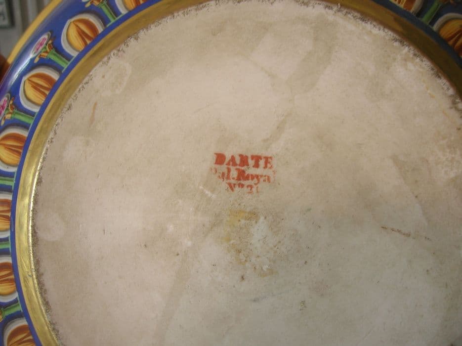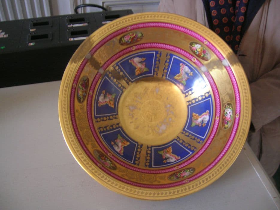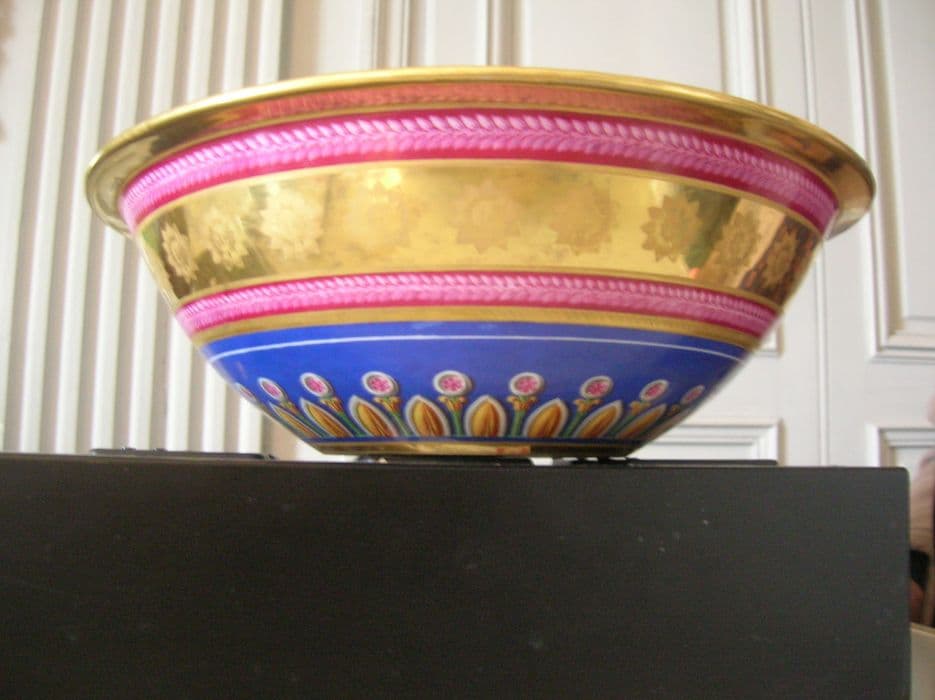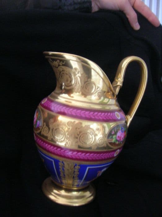 Aiguière, cuvette et pichet en porcelaine dorée avec bordures grenat, comportant des compartiments bleus ornés de dauphins.