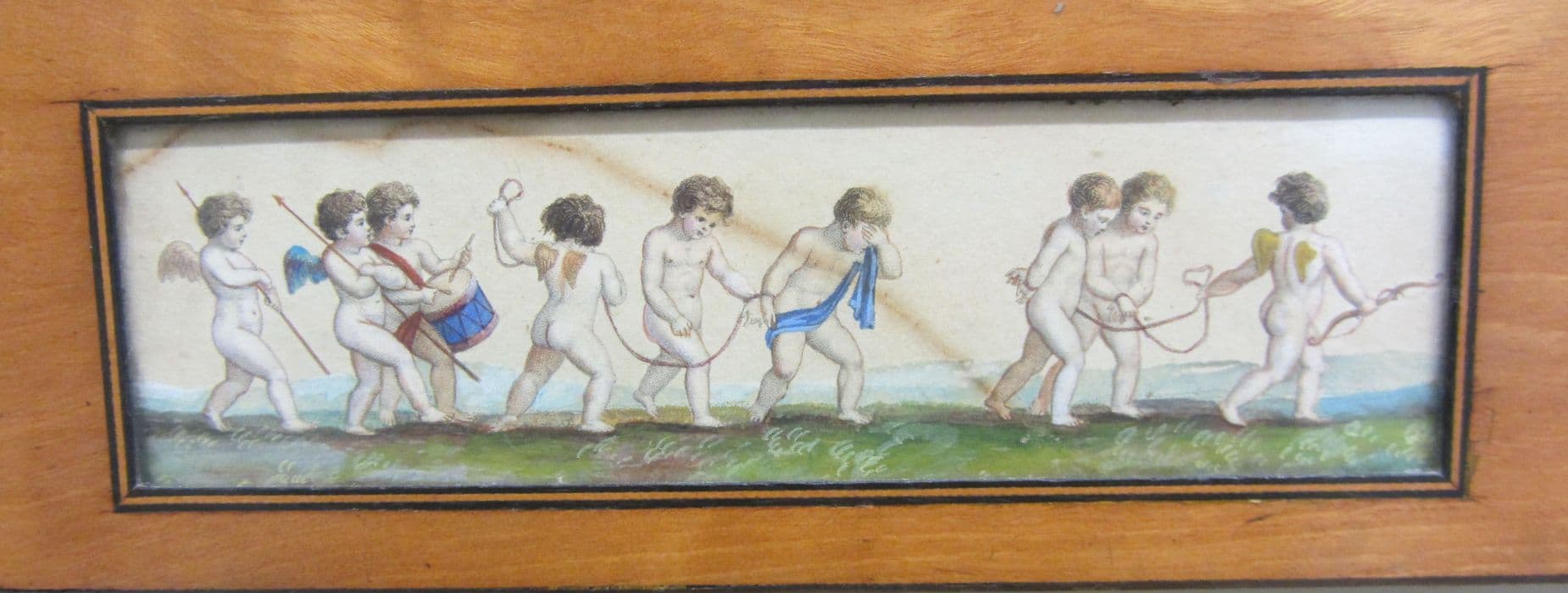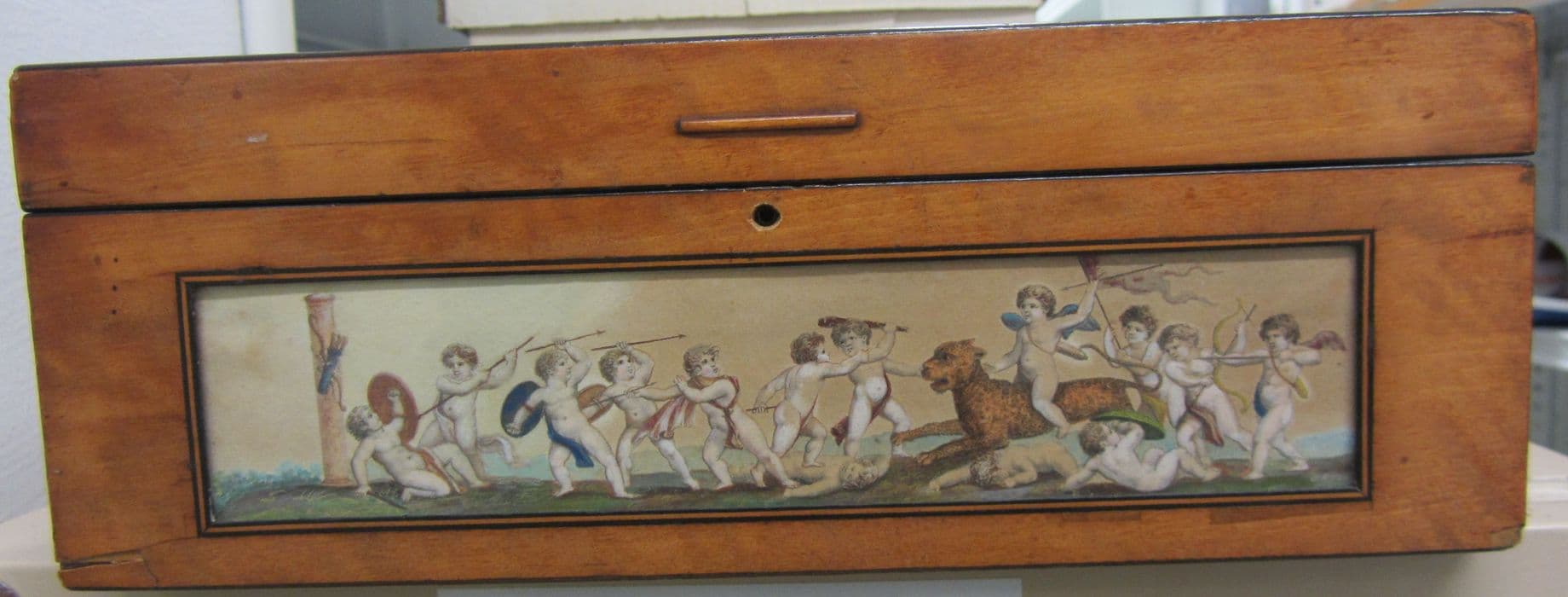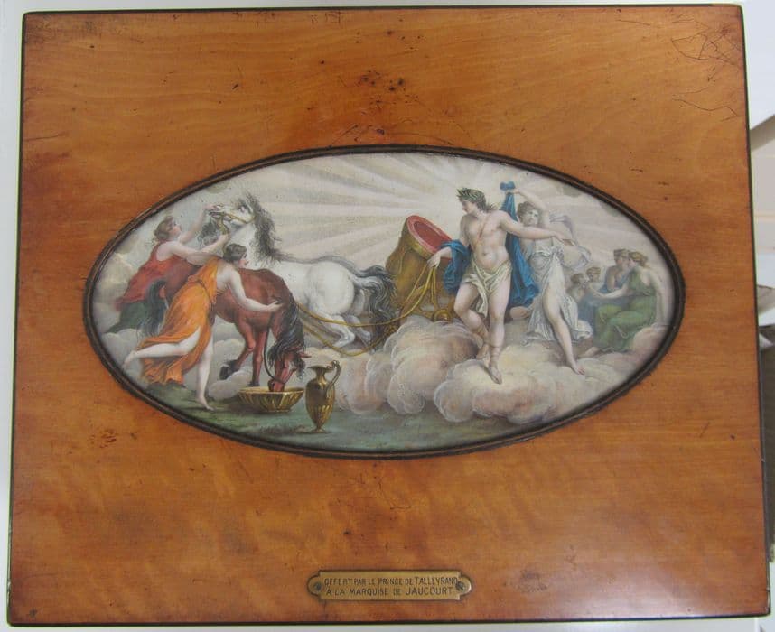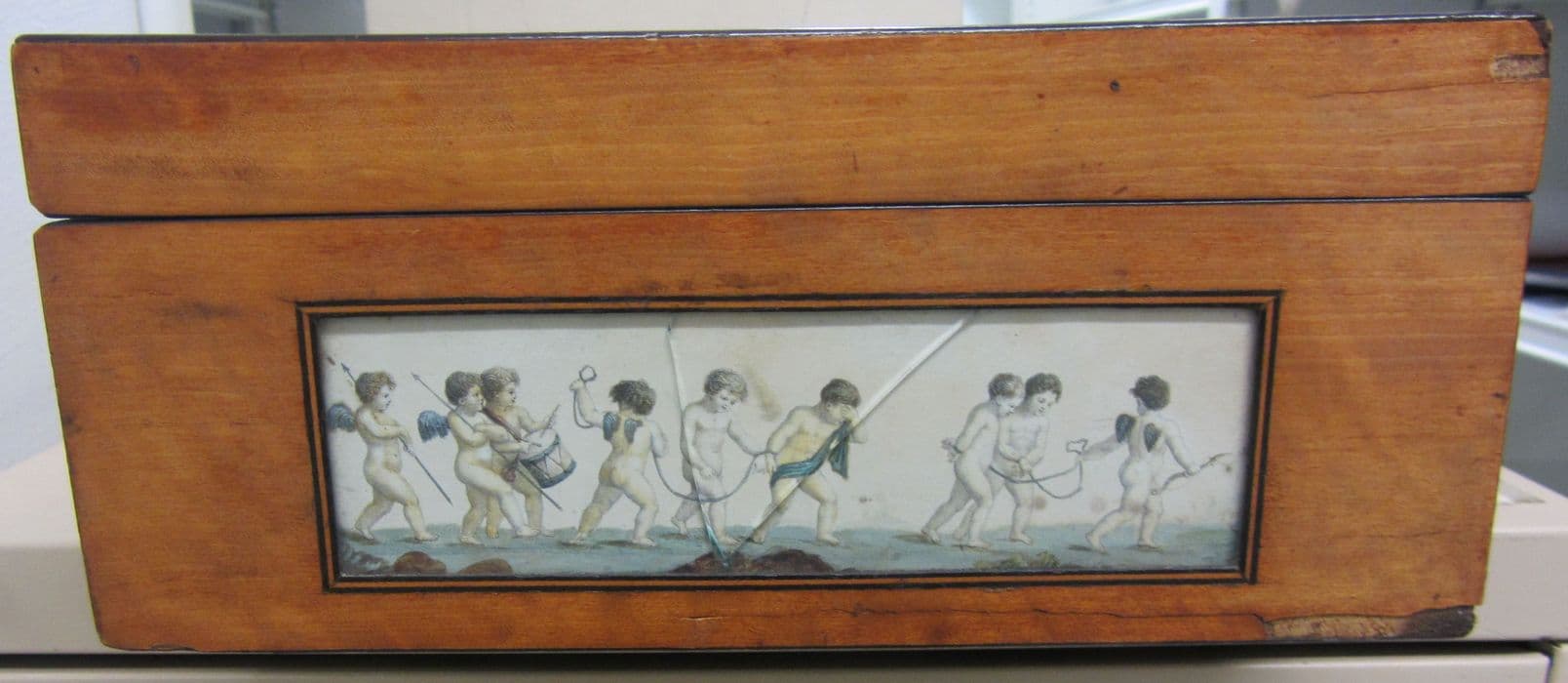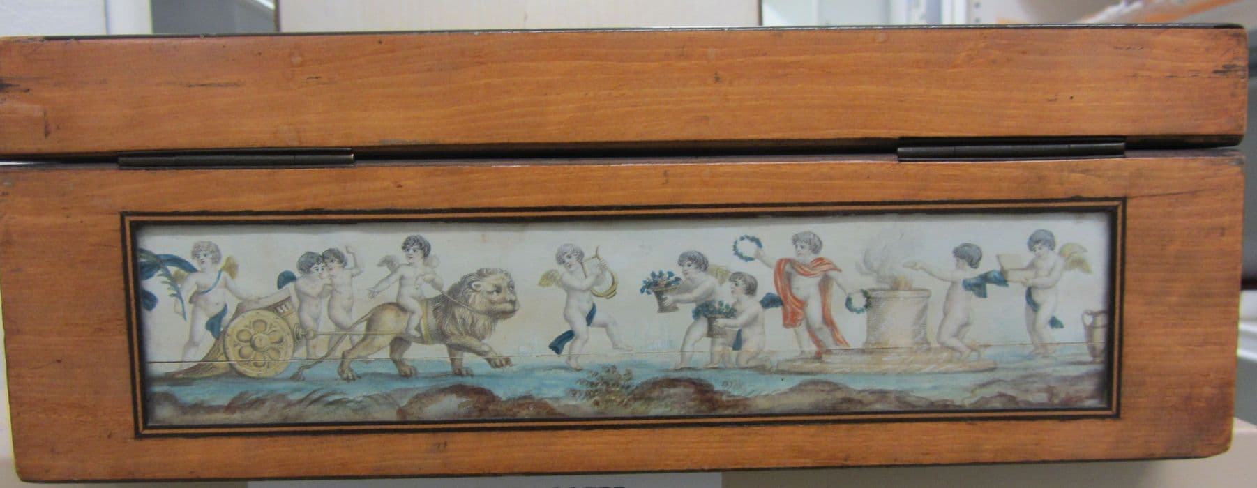 Coffret rectangulaire en placage de citronnier, marqueté en feuilles dans des encadrements à filets noirs, illustré sur le dessus et à l'intérieur du couvercle et sur les côtés par des lithographies rehaussées d'aquarelle.