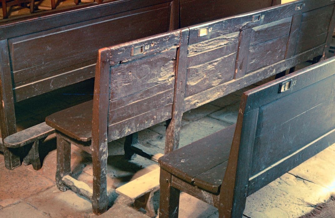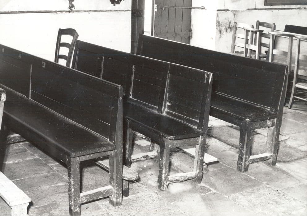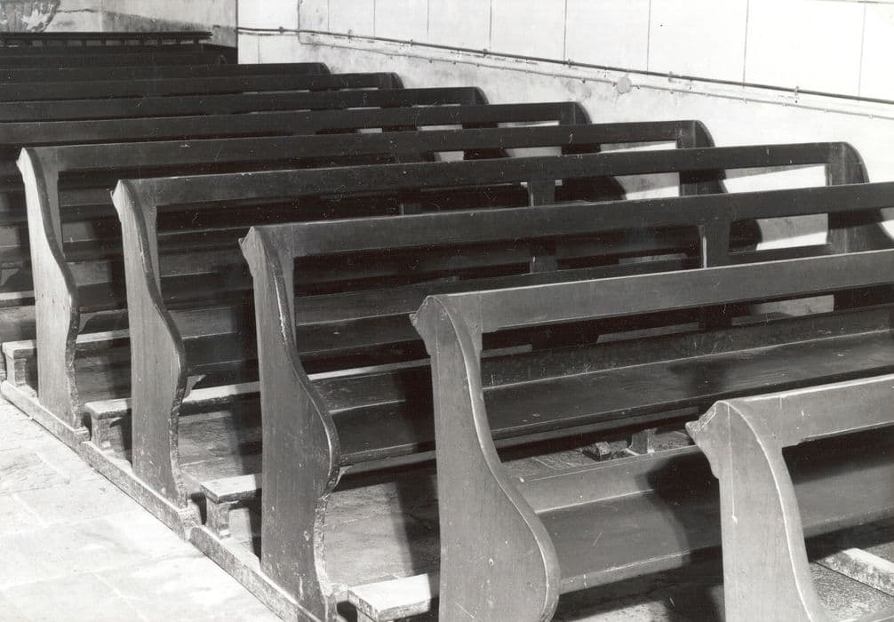 Deux ensembles de vingt-trois bancs de diverses longueurs : l'ensemble situé à gauche en entrant (quinze bancs) est composé de bancs plus hauts que l'autre.
