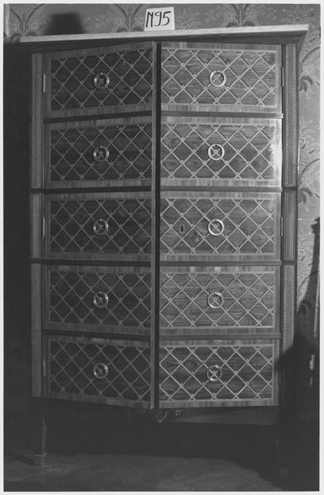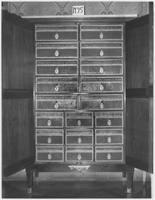 battants decouvrant 19 cartons en maroquin rouge, dont les titres sont dores aux armes de dupin de francueil