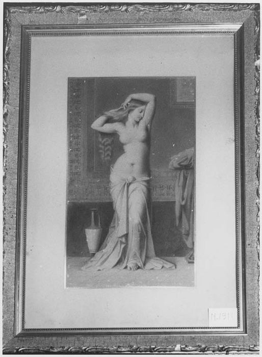 jeune femme a sa toilette, en pied, une amphore posee aupres d'elle