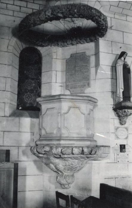 La chaire est soutenue par un cul-de-lampe sur le quel figure un aigle. Le baldaquin est remplacé par une couronne de pierre sculptée de feuillages et de marguerites rappelant la donatrice, Marguerite Orfray.