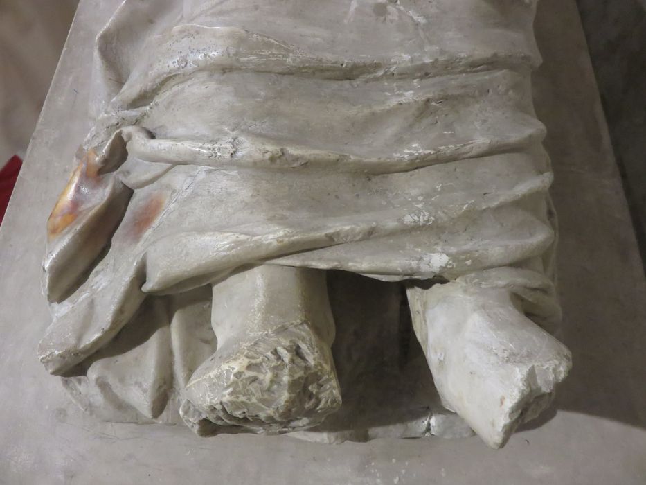 Récolement du 11/06/2021 : Quelques fissures, comblées en partie ; manquent les deux pieds ; les mains sont sans doute restitutions ; le nez, les lèvres et le menton sont manquants. Nettoyage probablement à envisager.
