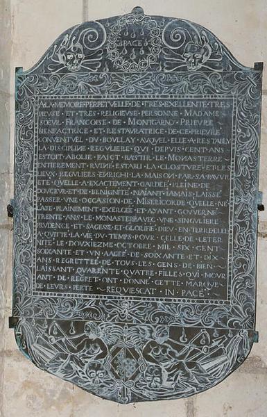 Plaque funéraire de soeur Françoise de Montgarny, prieure du couvent de Boulay, décédée le 12 octobre 1661, réalisée à la demande des religieuses du couvent (sources : Arnaud Paucton)