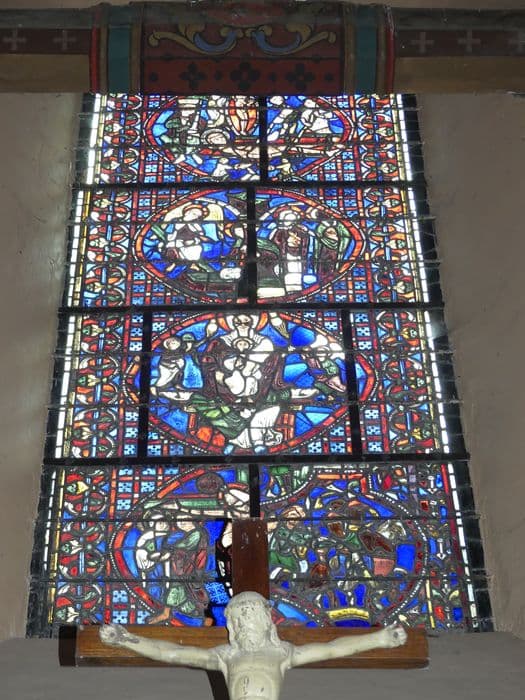 verrière : la Crucifixion, le Triomphe de la Vierge, les Saintes femmes au tombeau, le Martyre de saint Laurent, le Christ bénissant