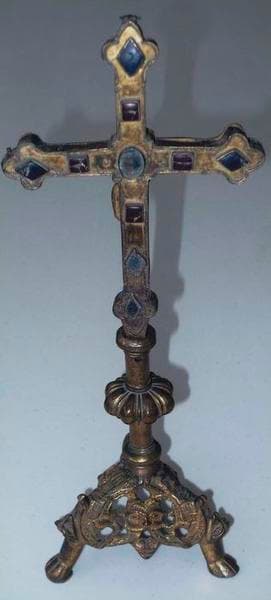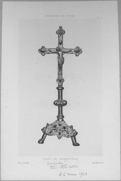 Croix fixée sur un trépied orné de masques et de rinceaux.