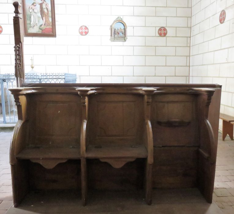 Six stalles. Deux groupes de trois stalles adossés à des panneaux sculptés sans doute de provenance différente.