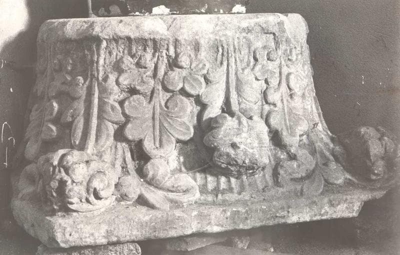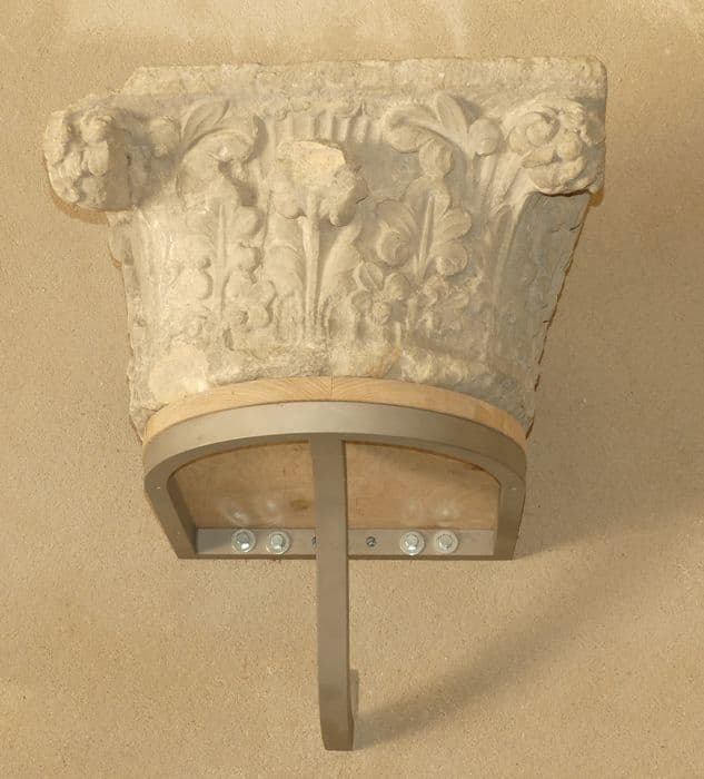A l'angle gauche de la façade ouest, encastré à l'extérieur dans des constructions modernes.
