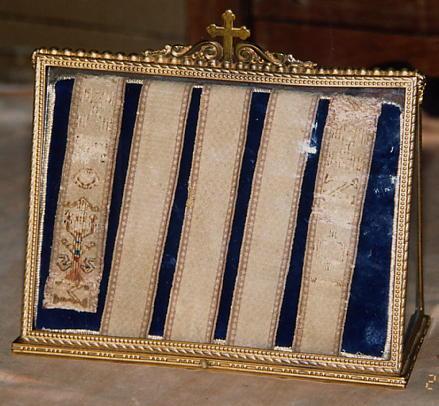 Cette relique autrefois très vénérée est enfermée depuis le 19e siècle dans une petite boîte translucide à trois faces sous un signet de l'archevêque de Tours. La trame est celle caractéristique des étoffes orientales des 9e et 10e siècles. Le fond est de couleur claire et les bordures violettes. Aux extrémités, est un dessin oriental en forme de rameaux.