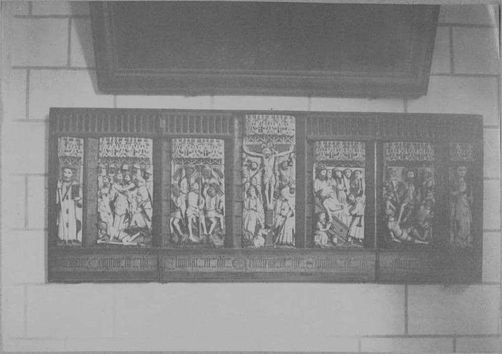 Ce retable, large de plus de deux mètres, repose à sa partie inférieure sur quatre fort scellements, mais n'est maintenu à sa partie supérieure que par une seule patte d'une solidité douteuse. Il serait prudent de placer en ce point de nouveaux scellements donnant toute garantie. A signaler également une fente, peut-être ancienne, à l'angle iinférieur gauche du panneau central (bordereau de récolement de 1936 complété par Docteur Lesueur, conservateur des antiquités et objets d'art).
