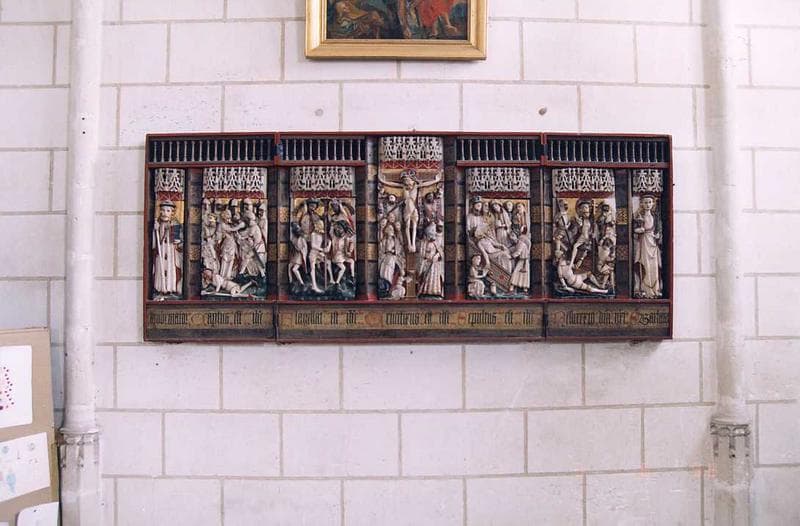 Constitué de 3 caissons amovibles en bois polychrome ; les caissons sont divisés en 2 ou 3 compartiments dans lesquels sont disposés 2 ou 3 hauts-reliefs d'albâtre partiellement peints.