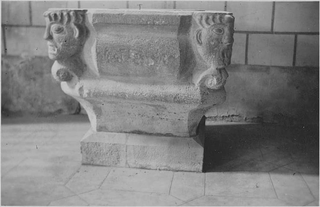 Montée sur une base carrée moderne, la cuve a été taillée dans un bloc cubique. A chaque angle fut réservée une figure humaine supportée par une volute.