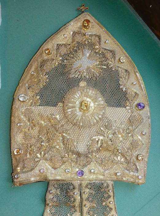 Cette mitre a appartenu au cardinal Meignan, archevêque de Tours de 1884 à 1896, qui la donna à la basilique Saint-Martin.