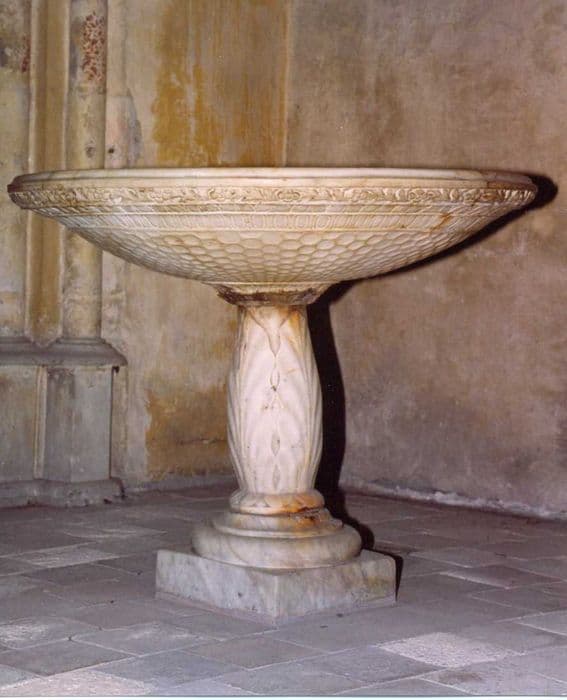 Vasque circulaire à cloison médiane posée sur un pied renflé, datant de la 1ère moitié du 16e siècle, posée sur une base de marbre du 19e siècle. Vasque composés de six éléments : cuve, pilier central (marbre de Carrare) ; base carrée, moulure sous vasque, deux séparations de la vasque (marbre de Carrare).