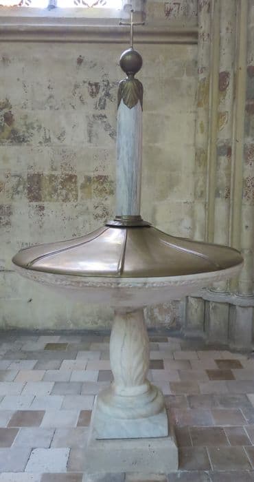 Complément 2017 : fût de colonnette en marbre cipolin gris, veiné de vert et de brun se terminant par un globe et une croix en laiton ; couvercle de huit quartiers en laiton s’articulant sur le piédouche de marbre blanc intercalé entre la vasque et la colonnette.