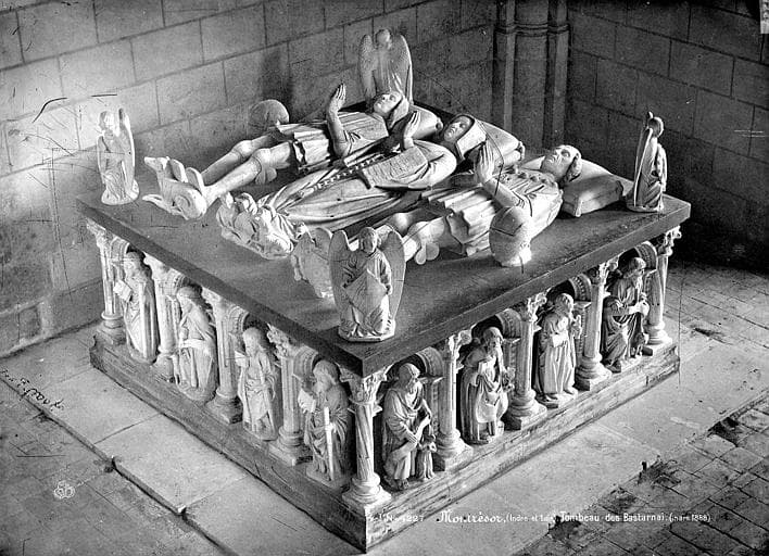 Tombeau daté du 16e siècle, restauré au 19e siècle sous l'impulsion de la comtesse Zamoyska, épouse de Xavier Branicki, par l'architecte F. Droguet et le sculpteur Breuil. Correspondance en 1914 relative à une délibération du conseil municipal à propos du tombeau pour qu'il fut remis à sa place primitive c'est-à-dire au milieu du choeur. Rapport de Paul-Frantz Marcou du 20 octobre 1915 (mention : présenté à la Commission du 29 novembre 1915 suivi de la mention : conclusions adoptées) : <I>Dégradé à l'époque de la Révolution et dépouillé d'une partie de sa décoration, le tombeau de la famille de Bastarnay qui depuis le XVIe siècle, s'élevait au milieu du choeur de l'église collégiale de Montrésor, en place du maître-autel, fut reconstitué et réparé en 1875 (?) par les soins et aux frais de la famille Branisky, propriétaire du château. Mais, à la requête du clergé, il fut alors déplacé et remonté au bas de la nef. Aujourd'hui, la même famille et le desservant demande qu'il reprenne sa place primitive dans le choeur et le conseil municipal appuie cette demande sous la condition que le travail sera exécuté aux frais du Cte Branisky, sous la direction de l'architecte des Monuments historiques. Si le tombeau a été déplacé il y a 40 ans, il peut assurément l'être à nouveau en 1915. Mais l'on doit se demander si, même sans qu'il ne doive rien couter au crédit des Monuments historiques, l'opération est, en elle-même, souhaitable, si d'autre part elle est exempte de tout danger. Dans l'ancienne église collégiale de Saint Jean-Baptiste, chapelle privée relevant du château, le tombeau des seigneurs du lieu, occupait sans inconvénient le milieu du choeur ; l'événement a prouvé que cet emplacement s'accomodait peu avec la nécessité d'un culte public dans une église [...] paroissiale. Les inconvénients reconnu en 1875 pourraient, dans l'avenir, si le monument reprenait sa place d'origine, provoquer une nouvelle demande de déplacement. Un monument de 2m30 de côté et de 1m05 (?) de hauteur, portant sur une épaisse table monolithe de marbre trois figures de gisants et garni sur ses côtés de 16 arcatures abritant autant de statuettes, ne se mobilise pas sans quelques risques, et ces risques il semble qu'il convient de les lui éviter quand la nécessité ne s'impose pas de les lui faire subir. Le tombeau n'est pas au [...] relégué, comme le dit le conseil municipal dans le coin le plus obscur de l'église ; il est placé au bas de la nef à proximité de la porte d'entrée qui l'éclaire amplement. Nous pensons que la prudence recommande de l'y laisser ; l'intérêt d'une reconstitution archéologique ne nous paraissant pas compenser les risques d'un démontage et d'un remontage inutilement périlleux.</I>
