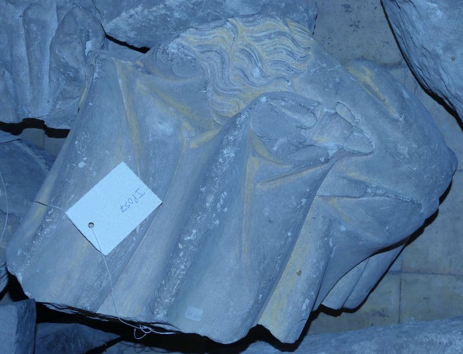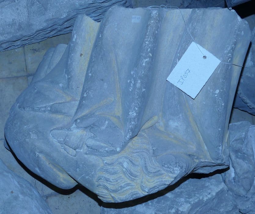 Bas d’une robe, aux longs plis sinueux. La robe tombe sur un lion couché sur un coussin. Fragment d’un pied de gisant. Madame Boucicaut ? Polychromie ocre présente sur l’ensemble. Dos creux.