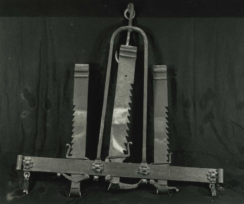 Crémaillère suspendue par un anneau, une fourche tient un montant auquel sont fixés trois portes marmites.