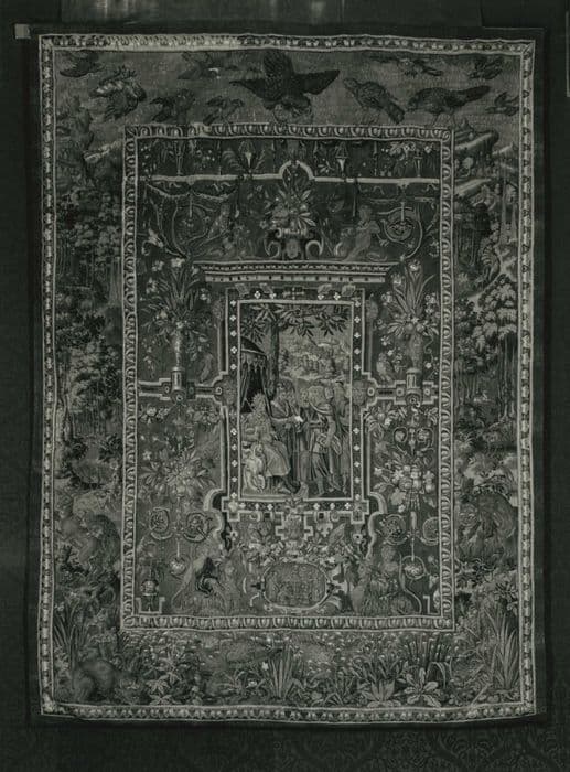 Inscription (sur l'œuvre, sur étiquette, manuscrit) ; encre : Azay-Le-Rideau (souligné) / Messager du Roi / terminé (rouge) ;inscription (sur l'œuvre, dans la bordure en bas à droite) : B écusson A (marque d'Anvers) ; inscription (sur l'œuvre) : HV (marque de Joost van Herzeele) ; inscription (sur l'œuvre) : MH 54201 C2 (sur la doublure en bas à gauche et à droite). (Cf. CMN, 2024).