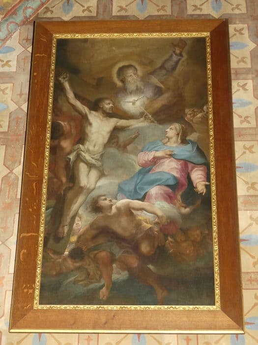 tableau : La Vierge Marie, élevée au Ciel, accueillie par la Sainte Trinité, cadre