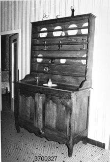 La partie inférieure est faite de deux vantaux sculptés. La partie supérieure comprend cinq étagères.