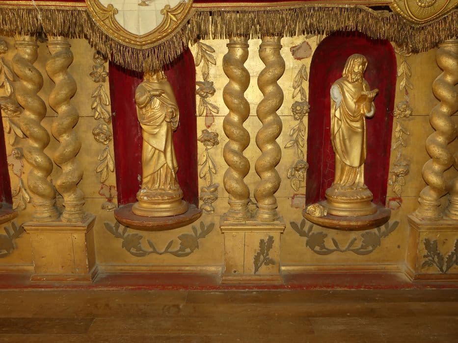 L'autel est composé de cinq travées séparées par des colonnes torses jumelles sur base commune. Chaque travée est creusée d'une niche entourée d'une ornementation végétale sculptée en bas-relief.