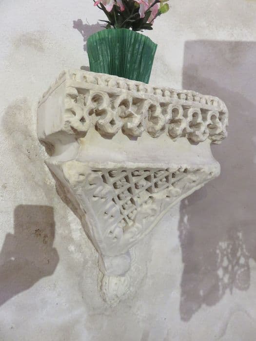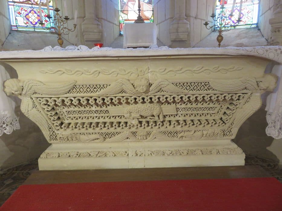 L'autel est galbé, mouluré et scultpé de motifs ornementaux. Les crédences d'appliques sans pied ont la forme de consoles à trois pans surmontées de tablettes rectangulaires.
