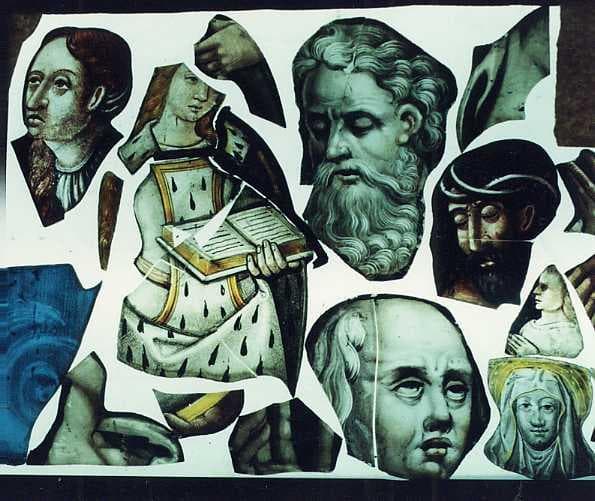 verre translucide (coloré) : peint, grisaille sur verre, jaune d'argent ; plomb (réseau)