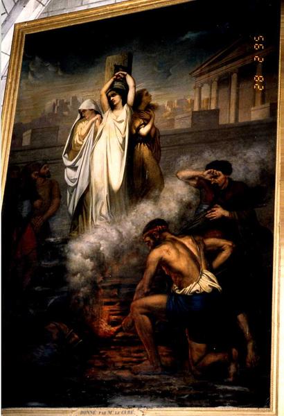 Au premier plan un homme de profil, un genou en terre, met le feu à un bûcher dressé. S'en échappe une épaisse fumée qui s'éleve en oblique en direction d'un second homme placé derrière lui, à droite du bûcher. Il s'abrite le visage du bras droit. Un poteau est dressé sur le bûcher. Y est adossée une jeune femme en longue robe blanche sur laquelle se concentre la lumière. Elle est représentée de face, les mains au dessus de la tête liées au poteau. Deux autres femmes l'entourent : l'une, à gauche, les mains jointes, est vue de face mais détourne sa tête couverte d'un voile ; l'autre, à droite, est de profil, adossée au poteau, les mains croisées sur la poitrine et la tête tournée vers le ciel. En retrait en partie gauche, un homme se tient debout et les regarde. En arrière-plan, au dessus d'un mur, un paysage de ville sous un ciel sombre occupe le tiers supérieur de la surface. On y voit en partie droite la façade d'un temple antique aux colonnes ioniques.