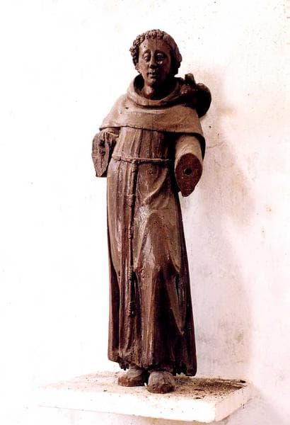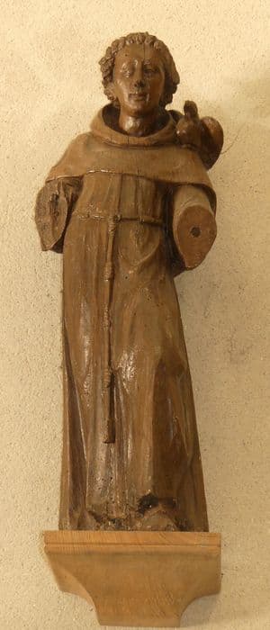 Saint François d'Assise est debout en habit franciscain, la jambe gauche légèrement fléchie. Un oiseau se tient sur son épaule gauche.