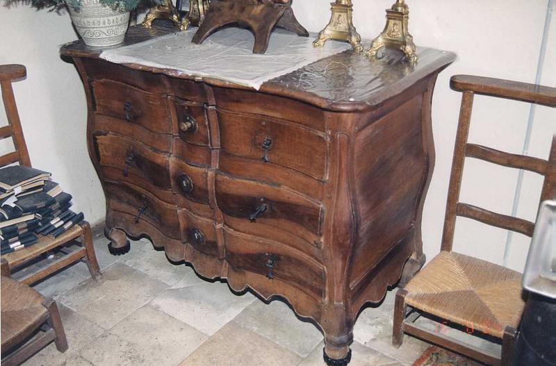 La commode d'élévation galbée comporte trois tiroirs superposés. Sur chaque tiroir une partie centrale plus étroite légèrement en saillie abrite la serrure ; les côtés comportent chacun une poignée. Les traverses inférieures de la façade et des côtés sont chantournées selon une symétrie centrale. Une mouluration souligne les angles du meuble.