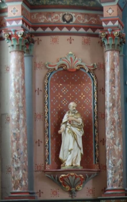 Pendant de la statue de saint Paul située dans la niche opposée du retable du maître-autel.